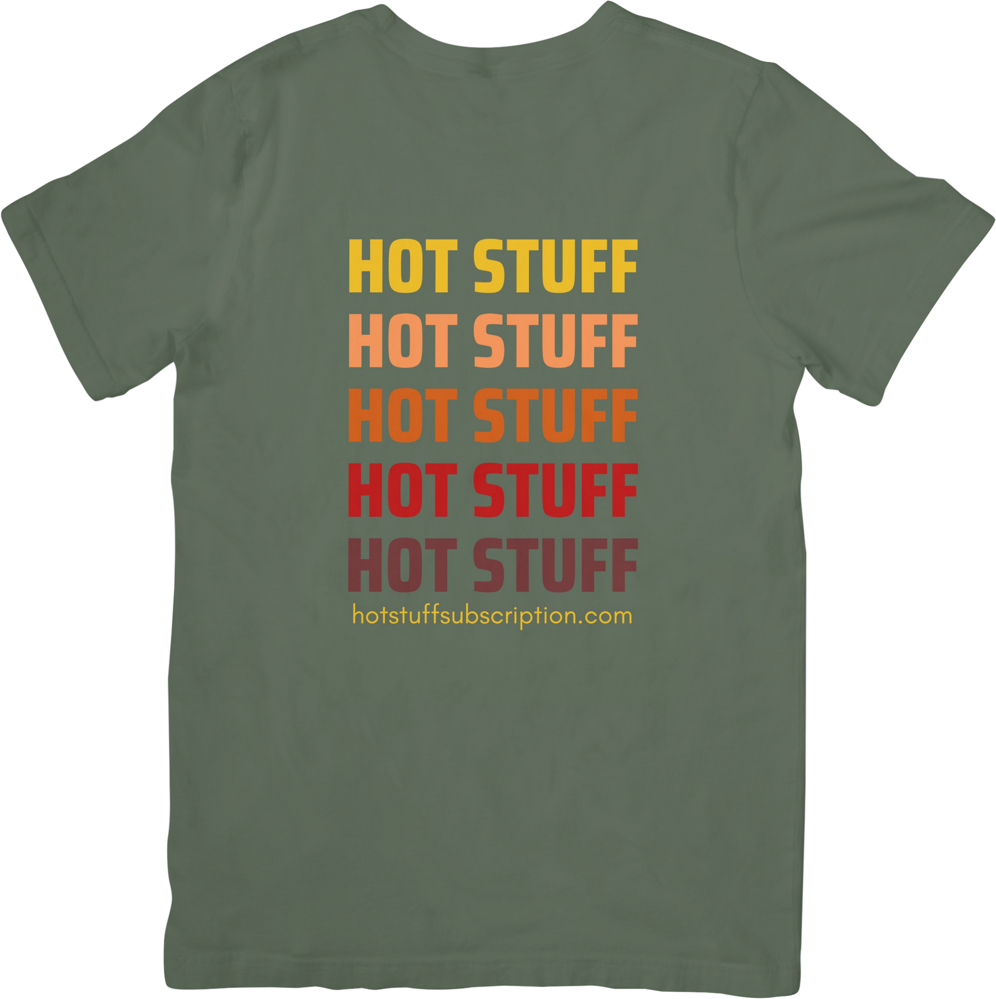 We turned an iconic NYC design and spiced it up! Our army green t-shirt is super hot with our "Hot Stuff" colorful print. Made of 100% cotton.