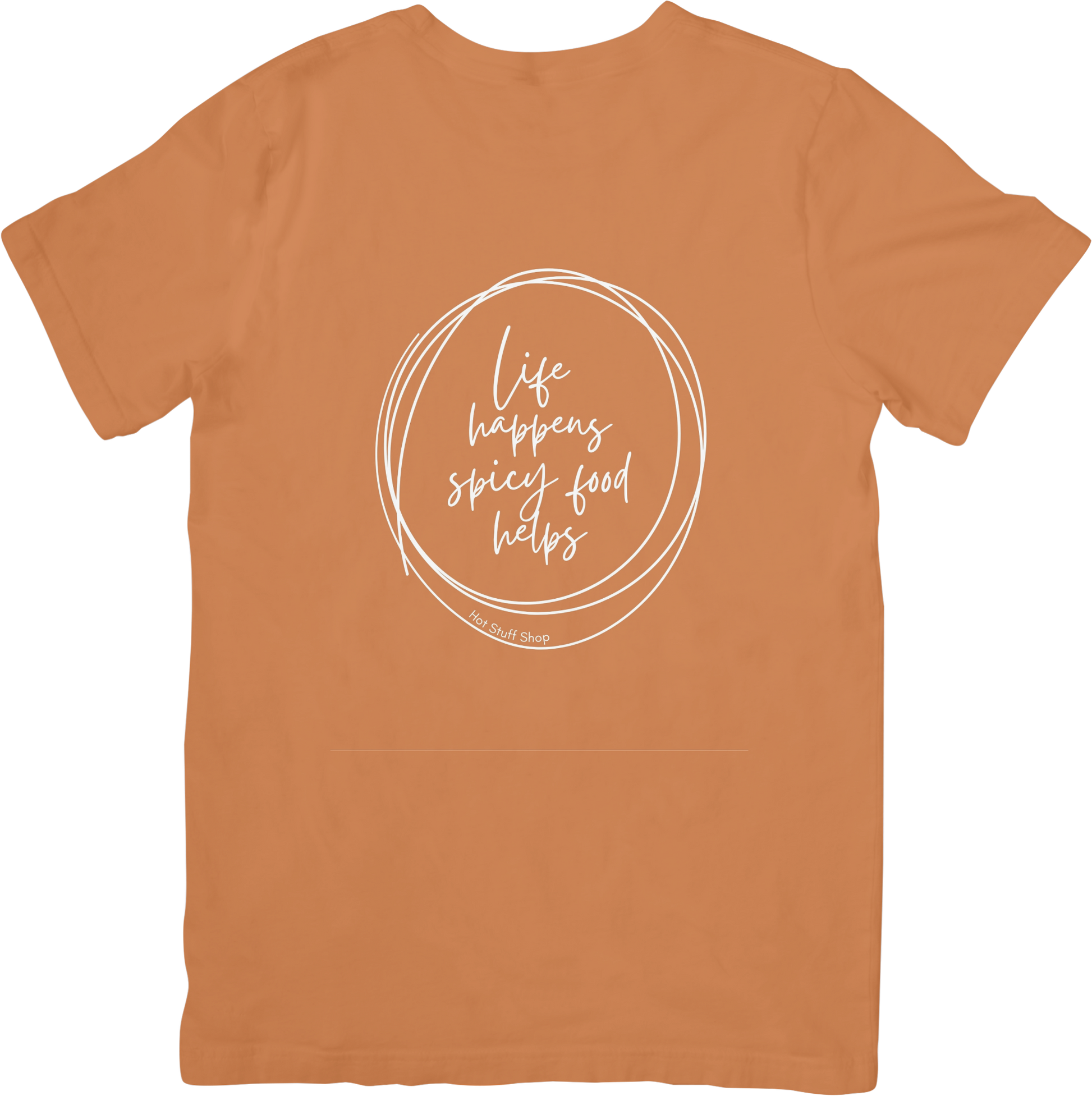 When life gets a little chaotic we turn to spicy food for a little comfort. How about you? Our new t-shirt "Life happens, Spicy Food Helps" comes in a beautiful sienna orange hue, and its super soft.